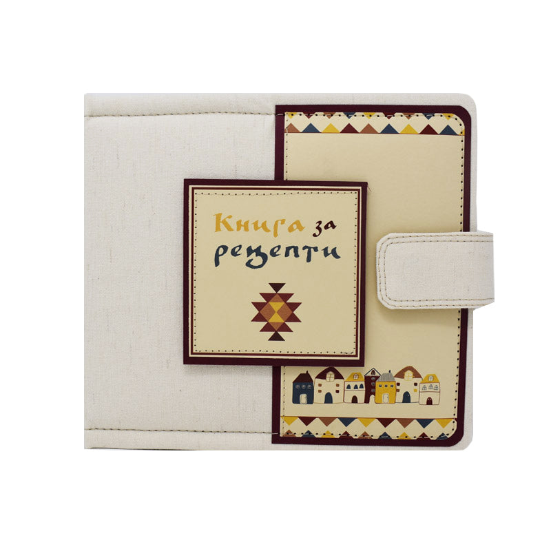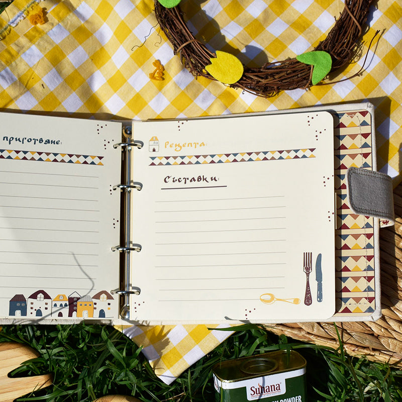 Ръчно изработен, авторски продукт, вдъхновен от традициите и българския бит. Книгата за рецепти е създадена, за да събере и запази рецептите на поколенията в семейството. Ринг механизмът дава възможност за прибавяне и разместване на страници. Има 50 бр. листа с размер на 21 см./ 21 см. отпечатани върху 190 гр. картон. Съдържа 4 бр. разделители: Пролет, Лято, Есен, Зима и Празник. Размер на книгата 26 см./ 22 см./ 4 см.