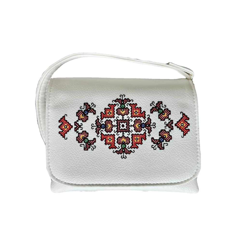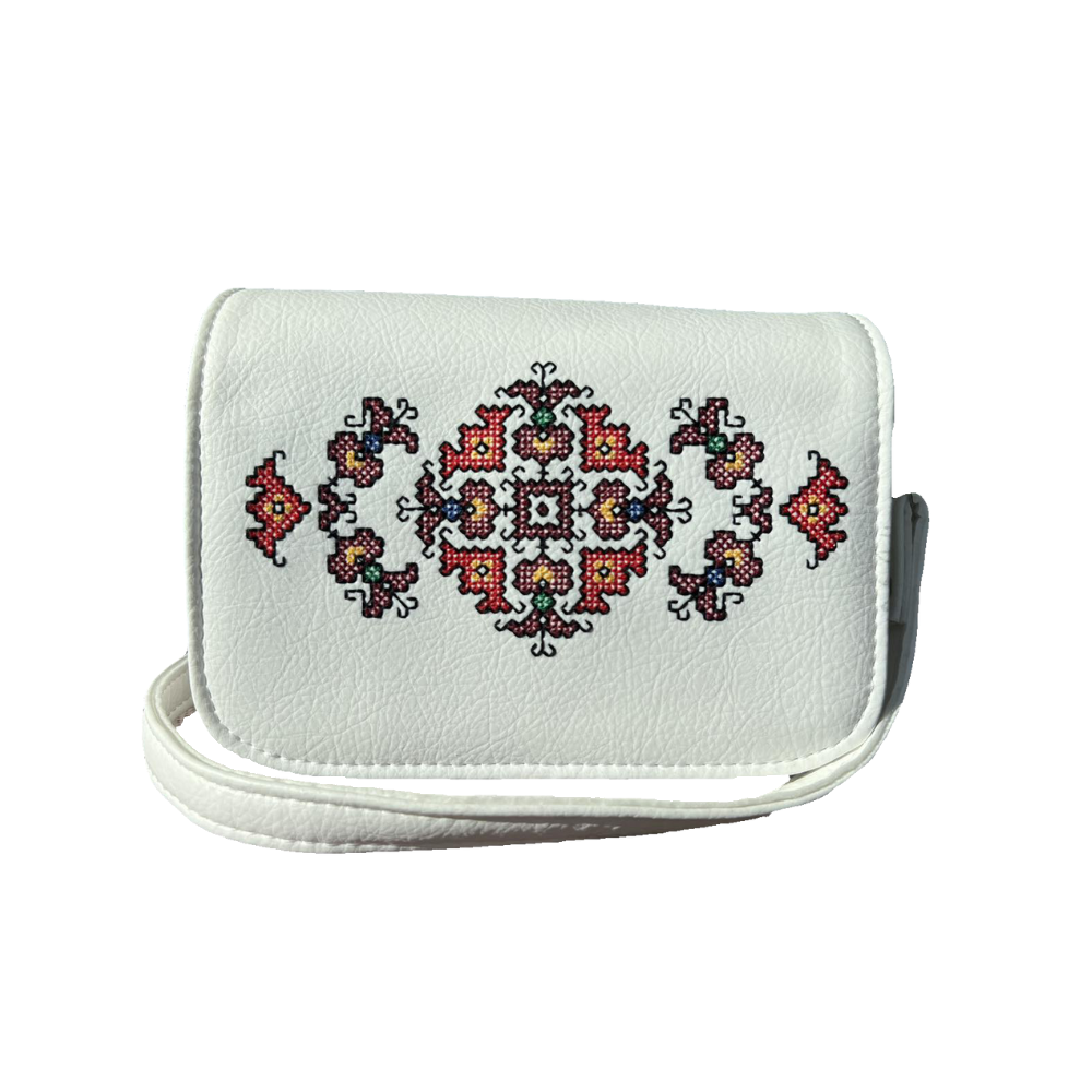 Кожена малка чанта с бродирани шевици "Смелост" - бяла