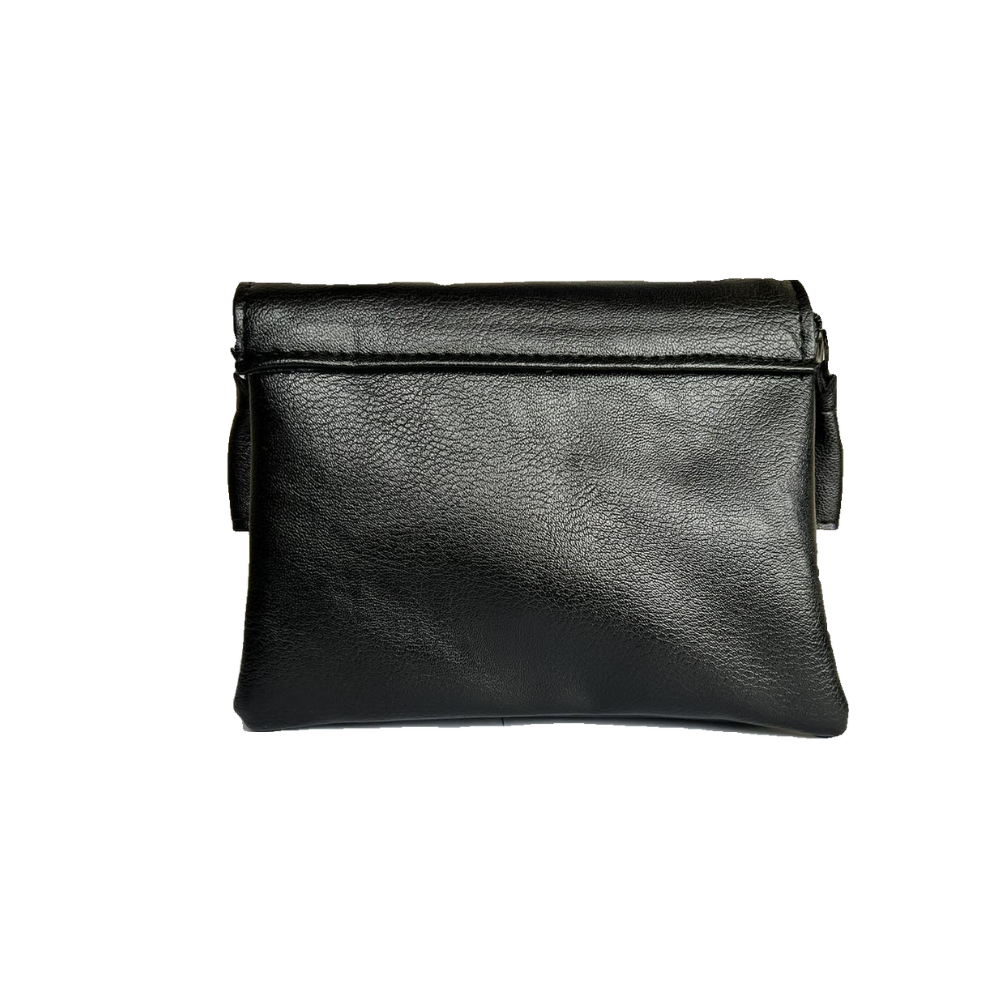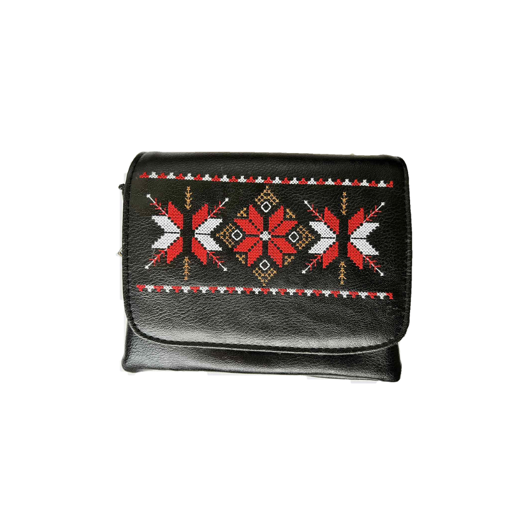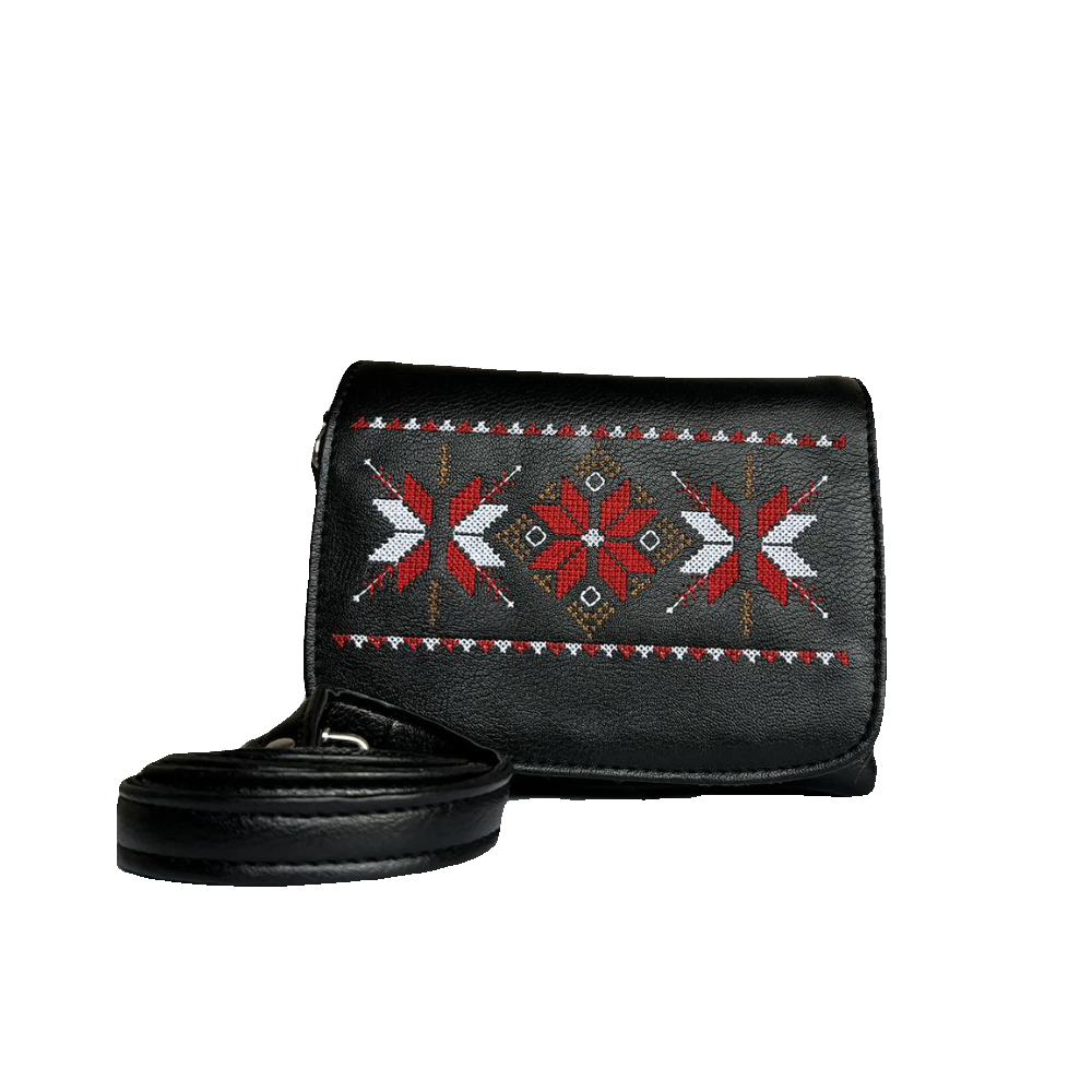 Кожена малка чанта с бродирани шевици "Обичай" - черна