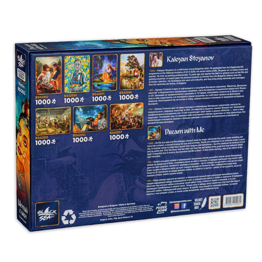 Станете част от българската история, обичаи и традиции като пресъздадете невероятните картини на знаменити български художници със серията български пъзели Black Sea Puzzles. Всеки пъзел е изрязан в класическа форма на частите от висококачествен картон с дебелина 1.9 mm.
